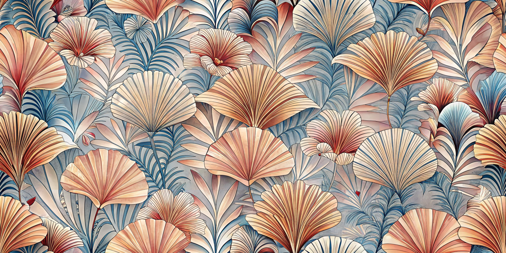 Embrace the beauty of nature with 'Ginkgo Glamour', a bold accent wallpaper featuring intricately detailed fan-shaped leaves. The dynamic interplay of warm coral and soft blue hues creates an elegant yet vibrant ambiance, perfect for modern interiors. This design exudes a sophisticated charm, ideal for making a stylish statement in any space.