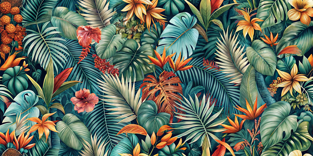 Immerse yourself in a lush paradise with the Tropical Escape wallpaper, featuring vibrant palm leaves and exotic flowers. This bold accent design brings the vibrant beauty of the rainforest into your home, creating a striking and lively atmosphere. Perfect for those looking to add a touch of nature-inspired elegance to any space.