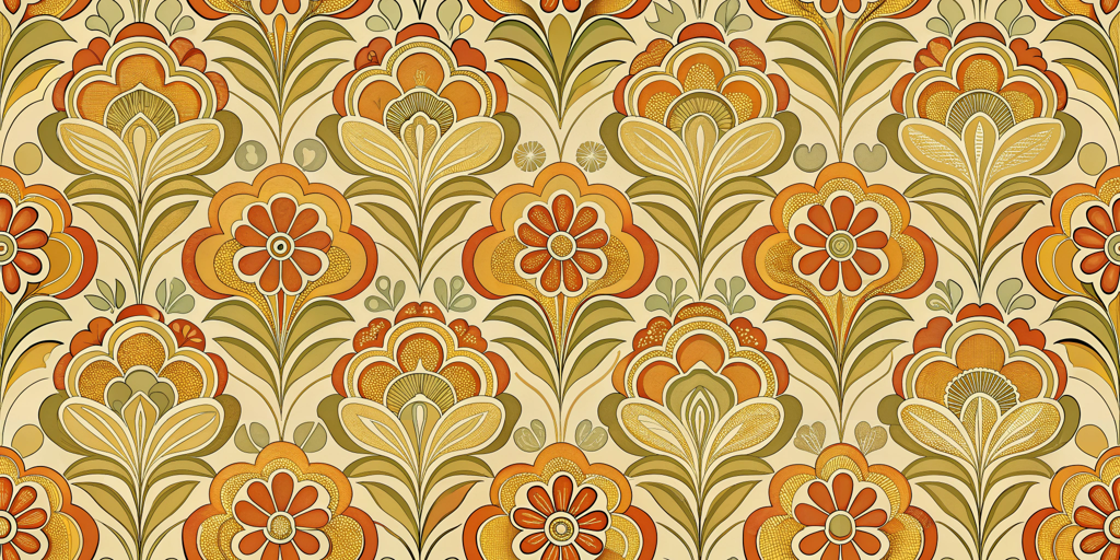 Embrace the timeless charm of 'Vintage Blossom', a retro floral wallpaper design featuring intricate orange and olive blooms. Ideal for adding a nostalgic touch to any room, this pattern beautifully captures the essence of 1970s decor. Transform your space with a flair of vintage elegance.