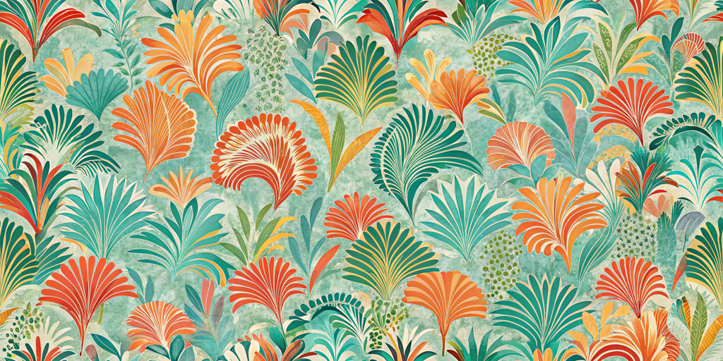 Experience a burst of nature with the 'Tropical Bloom Elegance' wallpaper, featuring vibrant fan-shaped foliage in vivid orange, teal, and green hues. This textured pattern adds a faux finish that brings the lively energy of tropics into your space, making it a perfect choice for accent walls and feature areas.